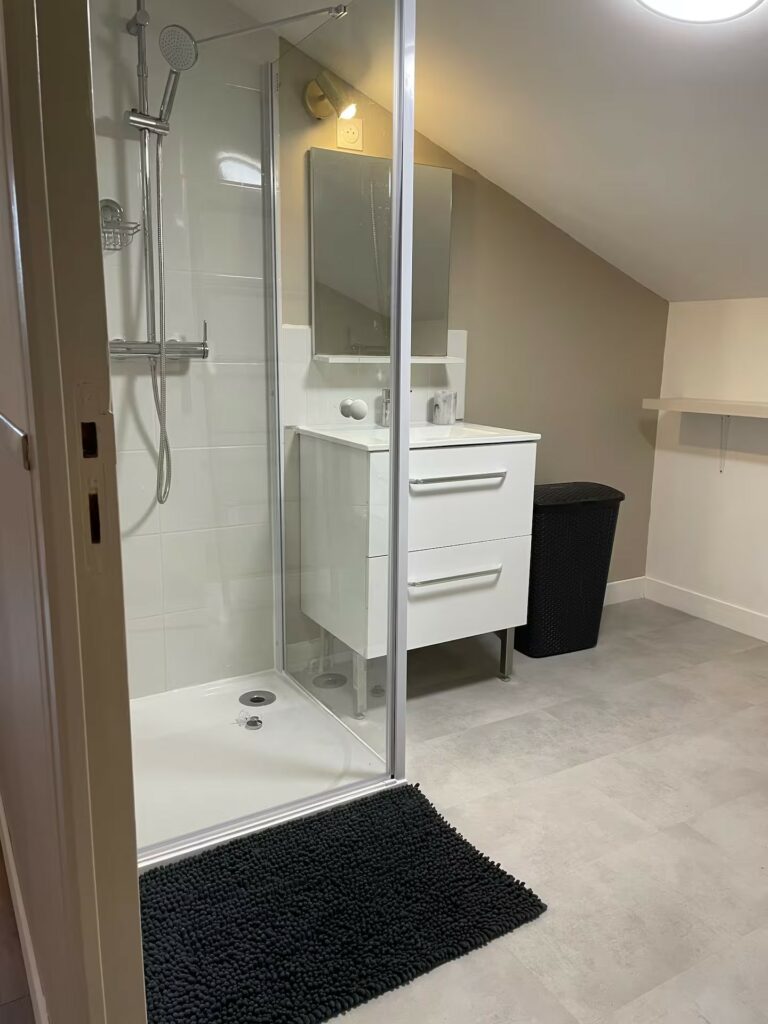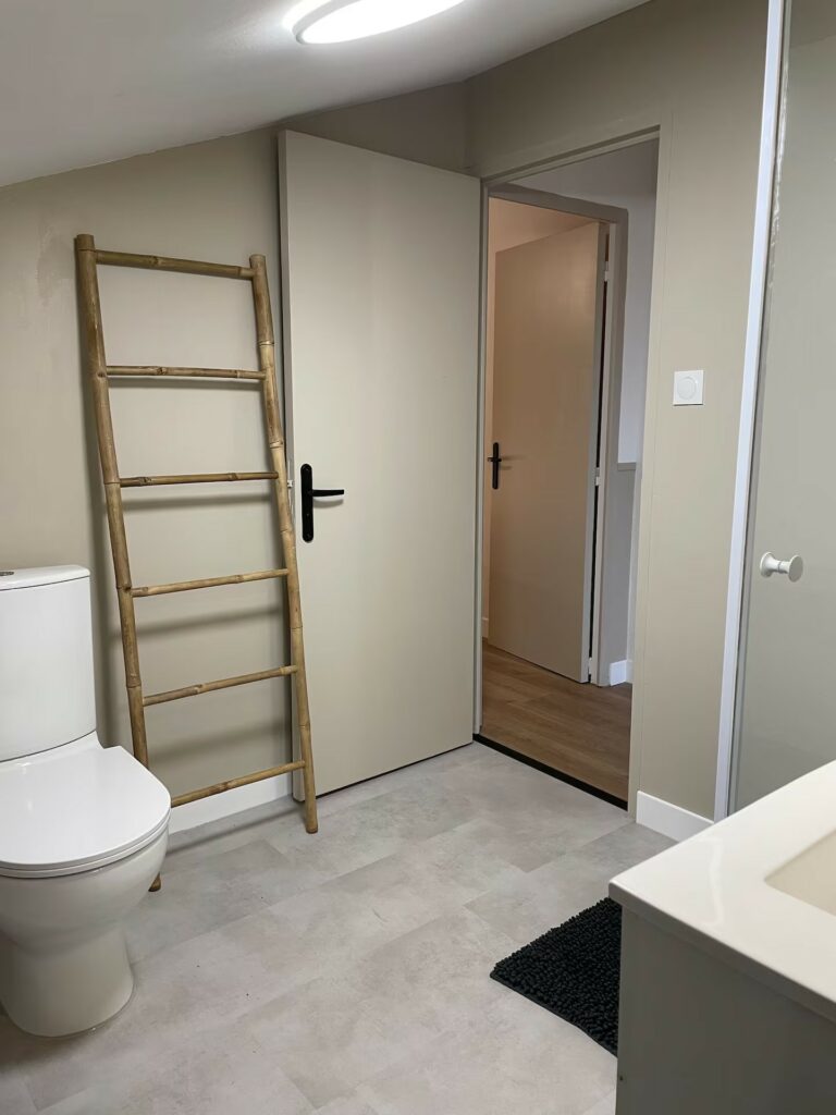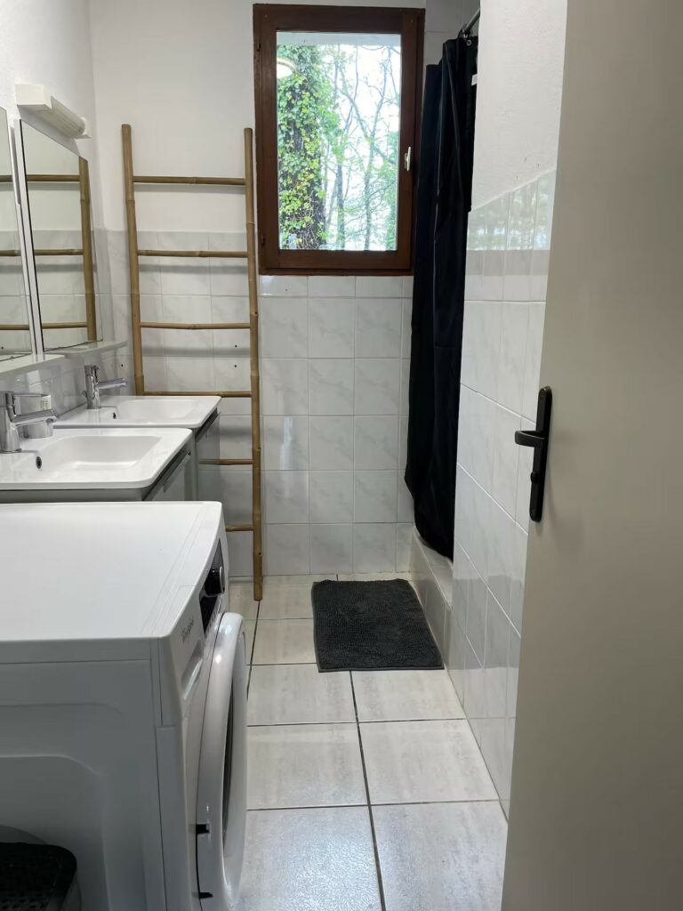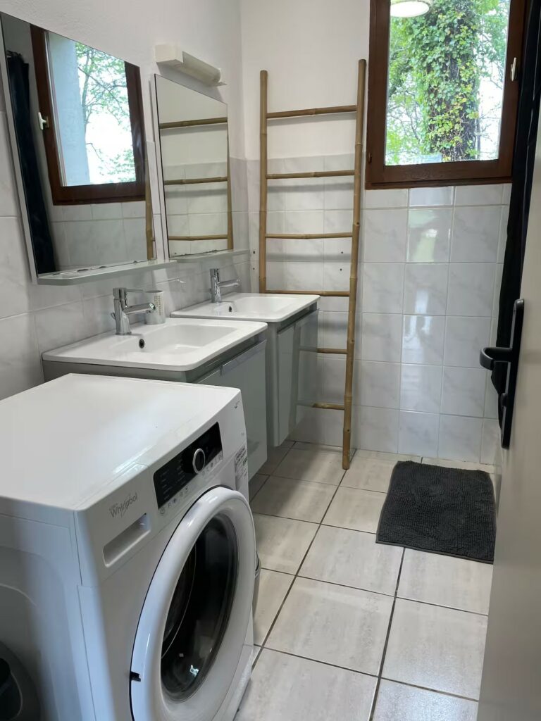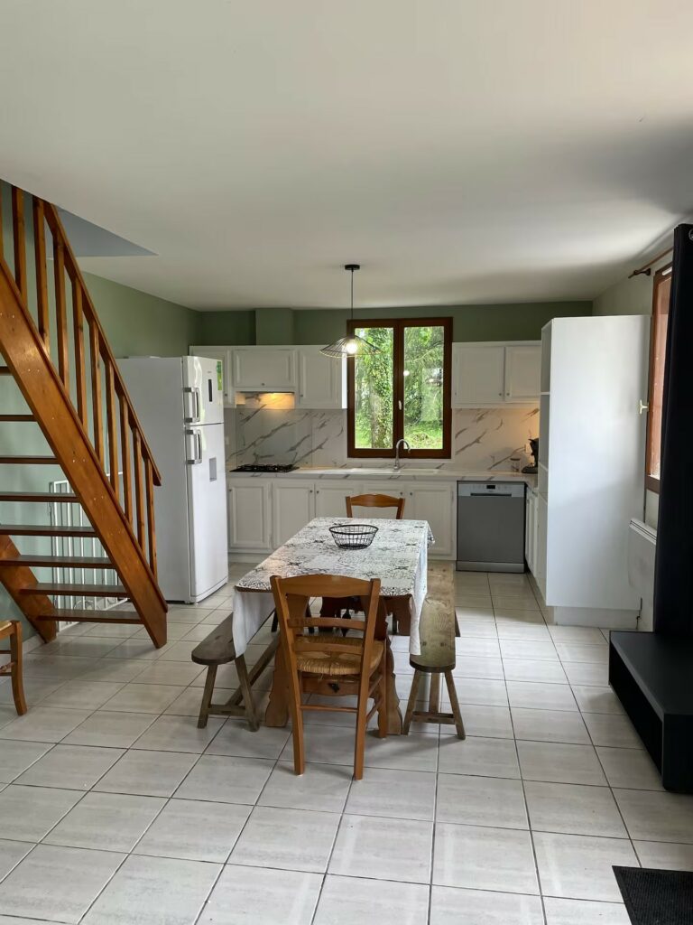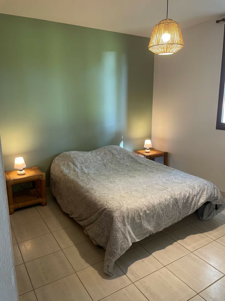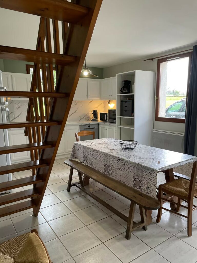 Au rez-de-chaussée, vous trouverez un séjour lumineux avec cuisine américaine entièrement équipée, 2 chambres avec lits doubles (140 cm), une salle d’eau avec douche et machine à laver, ainsi qu’un WC indépendant.