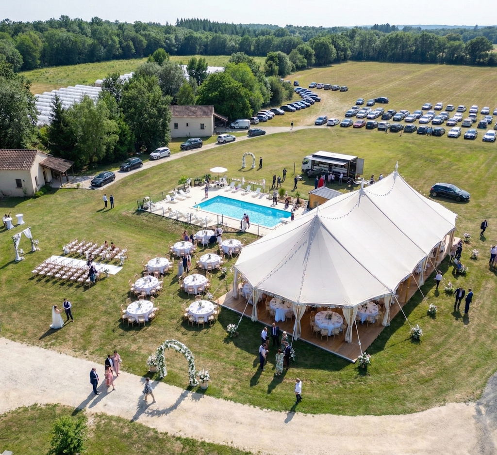 Nous proposons sur demande l’installation d’une tonnelle extérieure pour accueillir vos grandes réceptions en plein air. Profitez du cadre verdoyant de notre ferme familiale pour créer des souvenirs inoubliables.